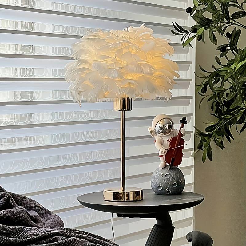 Bring a touch of softness and elegance into your space with this chic feather table lamp. Its delicate feather shade diffuses light beautifully, creating a warm, cozy glow that enhances bedrooms, living rooms, or vanity spaces. Supported by a sleek gold base, this lamp is both playful and luxurious — perfect for adding charm and sophistication to any setting.